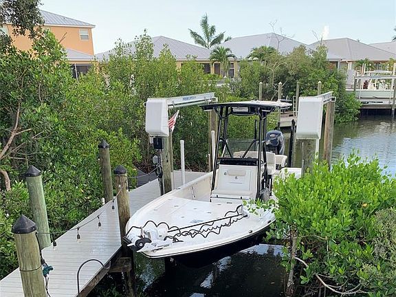 One or more photo(s) has been virtually staged. Waterfront Gulf Access Home located in the desirable gated community of Bimini Bay. Enjoy the Florida boating lifestyle with your PRIVATE DOCK and 7,500 lb boat lift with water/electric. An immaculate 4 bedroom, 2 bath home with spa has an open floor plan with oversized kitchen island and two beverage refrigerators. The owner’s bedroom ensuite has an oversized walk-in closet, double vanity sinks, custom walk-in shower and ceramic tub. NO CARPET, ceramic tile, crown molding and 8 ft doors throughout the home. A/C replaced with a 4 ton 18 seer Trane air conditioner. Pre-wired for a generator. The waterfront views can be enjoyed from the outdoor spa, screened lanai, shaded pergola or multiple decks in the back yard. There is room for aprox. 10'6 X 30' pool. No CDD, Low HOA fees, community pool and clubhouse. No flooding, no hurricane damage. Transferable flood insurance $1,685 year. Enjoy sunsets at Apollo Beach, two waterfront restaurants, coffee/ice cream shop and pizza on Apollo Beach Blvd! Easy access to I75 and conveniently located to Tampa, St. Petersburg, MacDill AFB, Tampa Intl and Sarasota!