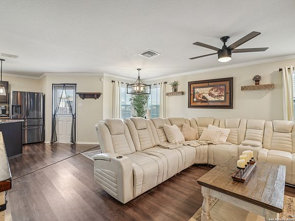 Discover the perfect blend of comfort, custom design, and community in this beautifully upgraded 1-story home featuring 3 bedrooms and 2 bathrooms. With stylish hard surface flooring throughout, every inch of this home has been thoughtfully curated for modern living. The inviting living room features custom built-in bookshelves with underlighting and a **custom-designed electric remote-controlled LED wall-mount fireplace**, creating a cozy and contemporary focal point that enhances both warmth and style. Throughout the home, you'll find **custom designer feature walls** that add character and a touch of luxury, complemented by upgraded fixtures that elevate each space.The spacious kitchen is a standout, offering generous cabinet and counter space, along with a large island that makes meal prep and entertaining a breeze.The oversized primary suite is bright, serene, and designed for relaxation, with a large walk-in closet to meet all your storage needs. Step outside to your private backyard oasis, where a **custom concrete patio spans almost the entire width of the home**, providing ample space for outdoor entertaining. A **custom fire pit** adds the perfect touch for evening gatherings and cool nights under the stars.Located in a vibrant and amenity-rich community where everything is within walking distance, you can **cancel your gym membership** and enjoy the **on-site fitness center** equipped with treadmills, ellipticals, weights, and more. Keep the little ones entertained at the **neighborhood splash pads**, cool off at the **community pool**, or shoot hoops at the **full-court basketball court**. Conveniently located near Loop 1604 and Hwy 90, you're just minutes from shopping, dining, and entertainment options. Don't miss your chance to make this custom-upgraded property your new home!