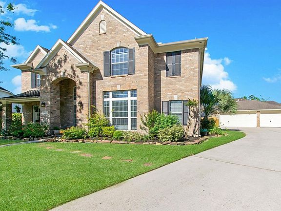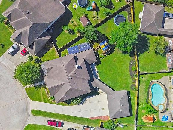 Lovely home with huge yard on cul-de-sac lot. 3 car garage. New roof 2019. Huge 2 story foyer! Study with French doors & exterior access to front porch. Butlers pantry/coffee bar in Kitchen near Dining room. 2 story Family Rm w/ fireplace, wall of windows, built-in shelving and wood laminate flooring. Kitchen has huge island w/breakfast bar seating, planning desk, glazed cabinetry, subway tile back splash, stainless appliances, and pantry. Breakfast room with built-in shelving and exterior access to back yard. Master has tray ceiling, access to covered porch, and large sitting area with windows. The en-suite bath boasts dual sinks, jetted tub, large tiled shower, & huge walk-in closet with shelving. Upstairs is a dual-area game room, and three large bedrooms with two Hollywood baths. Outside is a covered porch and extended patio. Huge 0.30 acre lot. Solar panels for energy efficiency. Great neighborhood with pool/clubhouse and activities! See first caption for link to video walk-thru!