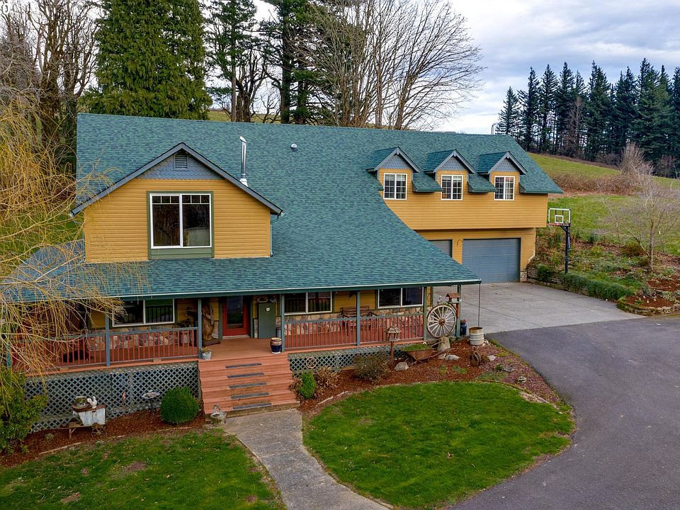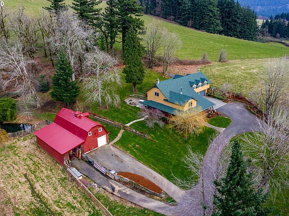 Turn-of-century farmhouse, remodel + 3500 SF addition 2000. Hardwood floors, open-plan Kit & DR. SS appl, eat bar. Huge Fam Room w/ hand-built fp of local river rock. Master Suite on Upper w/ gas stove, vaulted ceil, lg win, pvt patio. 2 addtl BR on Upper, Office & Loft, storage. Guest suite/addtl BR in separate wing off Kit. Wine Cellar/Game Room on Lower. Barn/shop & Lean-to built in 1980. 25 min to PDX, property is 100% fenced designed for cattle or horses. Wrap porch, patio w/ fire pit.
