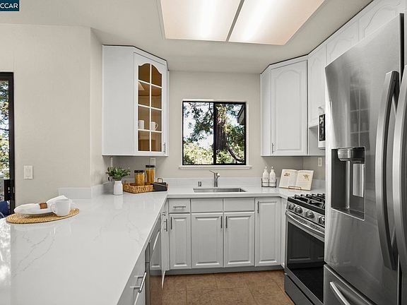 Gorgeous upper level condo with 2 bedrooms + loft area features vaulted ceilings and wood burning fireplace in the living area, an upgraded kitchen with new quartz countertops and stainless steel appliances including a gas range and included refrigerator and a quaint private patio area just off the dining area. The interior has been freshly painted, with new carpeting just installed, ceiling fans added to both bedrooms & loft area, new quartz countertops in both bathrooms as well as modern fixtures and finishes throughout. Enjoy abundant extra storage in the attic area adjacent to the loft, and overhead storage in the included one car garage. An additional assigned, uncovered parking space is included as well. Excellent location, just across the street from Holiday Highlands Park and convenient to Hwy 4 and I-680. Only 30 units in this small HOA, which also includes a community hot tub area.