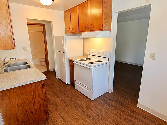 - Exterior features: Eat-in Kitchen, Electricity not included in rent, Free parking in lot. Optional stall in shared garage for $65/month., Free parking lot, Garbage included in rent, Gas included in rent, Heating included in rent, Heating: Gas, Hot water included in rent, Lawn, Lease start dates through 11/15 will be considered, On-Site Management, One Year Lease, Security doors, Sewage included in rent, Some plank flooring in available 1BR units, Top floor, Water included in rent