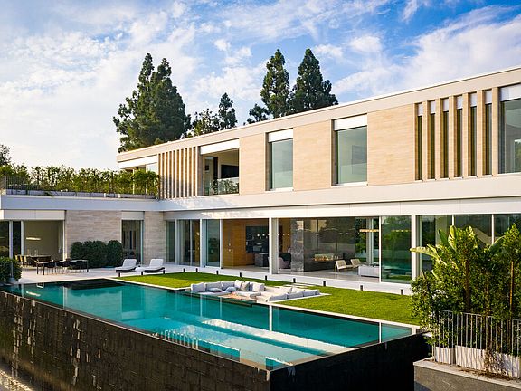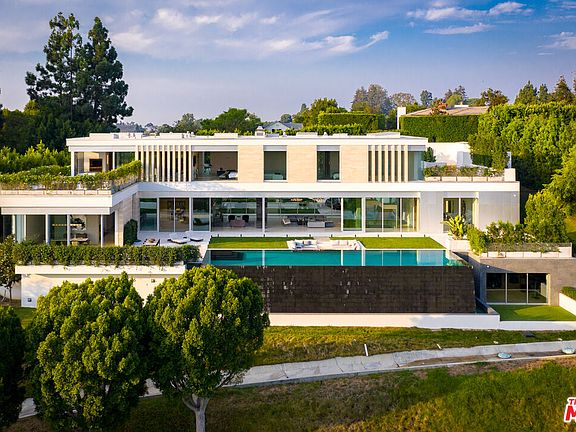 Extraordinary Estate by London-based Quinn Architects is a True Embodiment of Modern Luxury! Designed to impress, the home offers approximately 14,438 square feet of meticulously curated living space with floor-to-ceiling glass walls that showcase breathtaking panoramic views, set on nearly an acre of prime Lower Bel-Air real estate. The residence features an array of high-end amenities, including a grand glass atrium, expansive living areas, a chef's kitchen and an additional secondary prep kitchen. The main level provides a seamless flow between indoor and outdoor spaces, perfect for both intimate gatherings and large-scale entertaining. The upper level is dedicated to a sumptuous master suite, spanning around 2,100 square feet including a large private terrace complete with a spa and fire pit, and stunning views of the Bel-Air Country Club and city lights. The lower level is designed for ultimate relaxation and entertainment, featuring a game lounge with a bar, a state-of-the-art gym, a movie theater, and a temperature-controlled wine cellar. Additionally, the estate includes four spacious guest suites, a staff suite, and numerous outdoor amenities. The property is completed by a 65-foot infinity-edge pool, lush lawns, and ample patio spaces that extend the living area outdoors. This estate is a blend of contemporary elegance and sophisticated design. Truly a paragon of luxurious living in one of the most coveted locations in Lower Bel-Air.