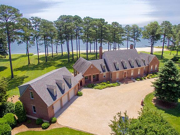 WHITE CAPS IS A MAGNIFICENT VA TIDEWATER ESTATE FEATURING A STATELY BRICK COLONIAL HOME W STUNNING VIEWS AND HUGE SAND BEACH SITED ON OVER 6 ACRES OF PRIVATE AND LUSHLY LANDSCAPED GROUNDS.WONDERFUL USE OF STRIKING DETAILS INCLUDING ARCHES,ANGLES AND HAND HEWN BRICK THAT ACCENTUATE THE HOME'S APPEAL AND ELEGANCE.GRAND BUT WELCOMING BRICK PILLARS LEAD THE WAY IN.3 BAY GARAGE WITH HUGE FINISHED OFFICE, ALMOST 900 SQ FT (COULD BE LARGE GUEST APT),COMPLETES LEFT HAND WING.22 MILE BAY VIEWS!