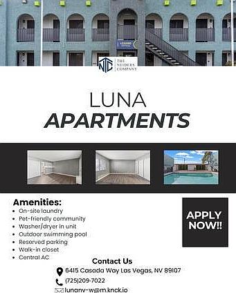 At Luna Apartments, every detail is designed to elevate your living experience. Ideally located in Las Vegas, just minutes from CSN College, top shopping destinations, popular dining spots, and seamless public transportation, our community keeps you connected to everything that matters. Live Where comfort meets convenience, and every day feels effortlessly inspired. Luna Garden Apartments 'studio, one, two- and three-bedroom premium value floor plans are the perfect fit for your lifestyle. Each spacious apartment is being designed with excellent amenities that make your life enjoyable, central air and heating, plank flooring, ceiling fans, refrigerators, spacious living room space area and much more. You'll love the abundant storage in our spacious closets. Our homes offer the incredible comfort and quality that you deserve. Luna Apartments, we don't just provide beautiful apartments, but a community where you feel welcome. Our on-call maintenance team is committed to helping you with friendly and responsive service. Chores are a breeze with the use of our laundry facilities. With spacious and guest parking, coming home has never been easier. Residents at Luna Apartments have access to take a refreshing swim in our resort style pool.