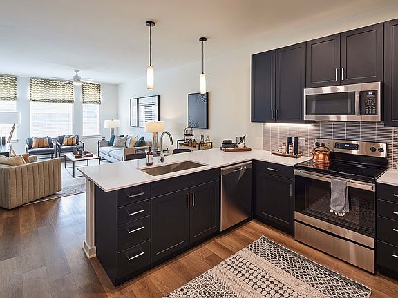 - Exterior features: Backlit mirrors in bathroom, Barbecue, Bicycle storage, Dark charcoal quartz countertops, Garden, Keyless fob entry, On-site bike share program, Package Receiving, Pet Park, Private garages available to rent, Sleek pendant lighting, Stacked grey tile backsplash, Stainless steel appliances