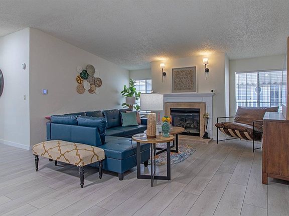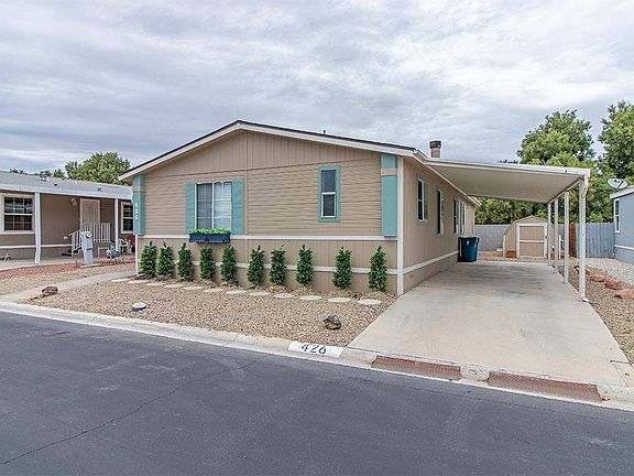 This upgraded 26x56, 3-bedroom, 2-bath manufactured home is offered for sale in a 55+ Gated Land Lease Community in Las Vegas, Nevada. It is set on a low-maintenance home-site. A shingle roof, eaves, covered parking, a matching shed, and a covered front deck are included. A split floor plan is featured. The primary bedroom is placed at the front, while the two guest bedrooms sit at the rear. The home is wider than many multi-section homes, and extra space is felt in the living and dining area. A factory-installed wood fireplace sits in the living room and is framed by large windows for natural light. The primary bedroom offers two walk-in closets, a large en-suite bathroom, a garden tub, dual vanities, linen cabinets, and a separate shower. The galley kitchen has upgraded counters, appliances, and a pantry. A skylight and recessed lighting have been added. The kitchen sits between the dining room and a rear breakfast nook. The laundry room is next to the breakfast nook just inside the rear door. The two queen-size guest bedrooms at the rear include reach-in closets. The guest bathroom includes a tub/shower combo with a glass enclosure and an upgraded vanity. The interior and exterior have been recently painted. Flooring, baseboards, and window coverings have been upgraded. The owner reports that PEX plumbing lines were also recently installed.