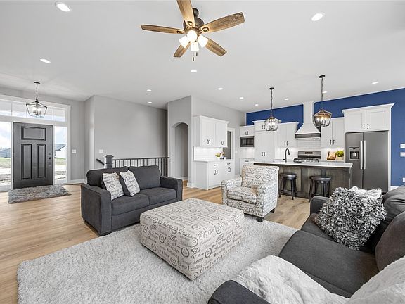 Award Winning Builder, Platten Construction has an impressive new construction ranch in a great location with 5 bed and 3 baths and over 3300 sq ft finished. Open floor plan with large main living area and beautiful stone surround electric fireplace with mantel. The kitchen features custom white cabinet, quartz counter tops, beautiful tiled backsplash, soft-close dove tail drawers, huge hidden walk in pantry with counter top and large custom stain island with plenty of storage. You'll love the primary suite with large walk-in closet, & dual vanities with custom tile shower. More features include: Drop zone locker area, large laundry room, accent lighting throughout, stainless steel appliances, plumbed for central vac, trey ceiling in the primary bedroom. The lower level offers a large rec/bonus room with wet bar, two more bedrooms and full bath. Enjoy the outdoors with large covered patio off the dining room.