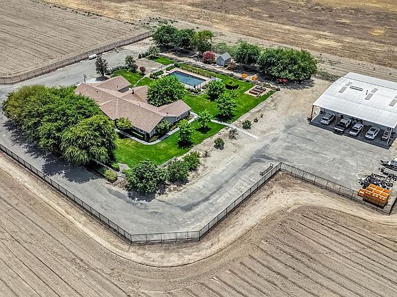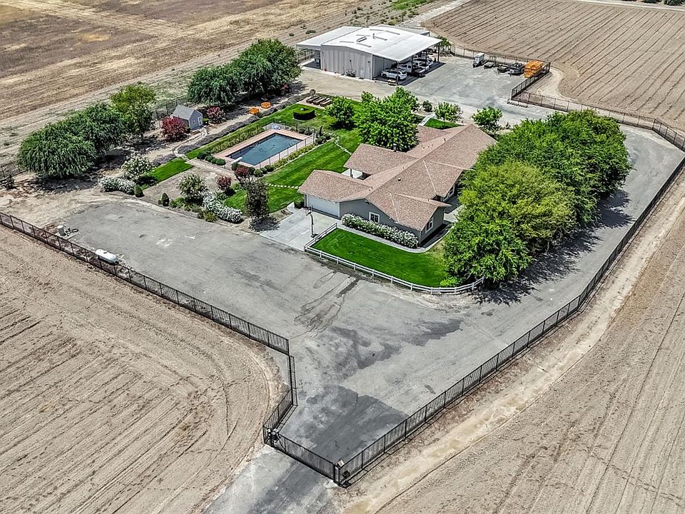 Welcome to this stunning 2,854 sq ft ranch estate set on 20 acres of land, offering the perfect combination of luxury living and agricultural potential. This beautifully remodeled home features 4 spacious bedrooms, 3.5 bathrooms, an updated kitchen, family room, dining area, and a dedicated office space. A cozy fireplace adds warmth and charm to the living space. Step outside to a Pebble Tec pool, fully enclosed with elegant wrought iron fencing, creating a private oasis. The house, landscaped yard, pool, and a 40x60 ft shop with three large eaves are all securely contained within a 2-acre fenced section. Beyond the home site, approximately 17 acres of prime farmable ground await, supported by both an agricultural well and district water. Whether you're looking for a country retreat, a family homestead, or a working farm, this rare property offers exceptional versatility and value.