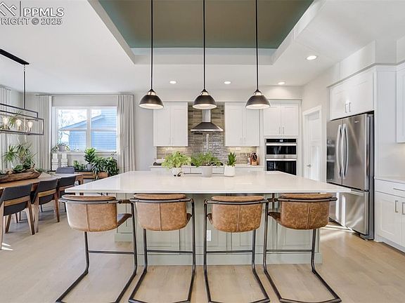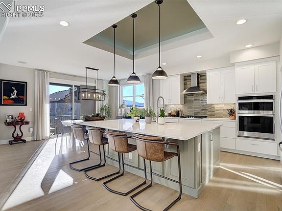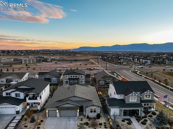 Former Toll Brothers Parade of home provides elevated living with timeless sophistication and modern comfort. With finely curated living space, custom upgrades and thoughtful design, you’ll experience exceptional craftsmanship, designer finishes, and a floor plan ideal for both refined entertaining and everyday ease. The main level showcases an open-concept great room with rich hardwood flooring, expansive windows, and a stunning brick fireplace. A gourmet kitchen features an oversized center island, premium appliance package, walk-in pantry, and seating designed for gathering. Designer lighting, custom wall details, and elevated finishes create a warm yet luxurious ambiance throughout. The eat-in kitchen area also has a sliding patio door, and an extended door off living room leads you to a large partially covered patio to enjoy Colorado life year round! The primary suite is a private retreat, featuring wood beams and a spa-inspired double headed curbless shower and a large customized walk-in closet. A distinguished home office with built-in cabinetry provides the perfect environment for work or quiet study. A second extended bedroom and full bathroom on the main floor is ideal for multigenerational living. The custom laundry room on main provides abundant storage and utility sink. The lower level is designed for both relaxation and recreation with 9 ft ceilings, a built-in 5.1 surround sound home theatre system, spacious family room with built in bar and floating shelves, a second gas fireplace, and room for billiards and games. The wood and brick wall treatments through the home, and upgrades fixtures add such style. A third bedroom has attached bathroom, and the fourth bedroom would make a great work-out or hobby room! Insulated garage and whole house audio system are a nice touch! Located in the highly rated District 20, Wolf Ranch offers miles of trails, community events, and convenient proximity to shopping, dining, healthcare, and military installations.