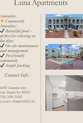 At Luna Apartments, every detail is designed to elevate your living experience. Ideally located in Las Vegas, just minutes from CSN College, top shopping destinations, popular dining spots, and seamless public transportation, our community keeps you connected to everything that matters. Live Where comfort meets convenience, and every day feels effortlessly inspired. Luna Garden Apartments 'studio, one, two- and three-bedroom premium value floor plans are the perfect fit for your lifestyle. Each spacious apartment is being designed with excellent amenities that make your life enjoyable, central air and heating, plank flooring, ceiling fans, refrigerators, spacious living room space area and much more. You'll love the abundant storage in our spacious closets. Our homes offer the incredible comfort and quality that you deserve. Luna Apartments, we don't just provide beautiful apartments, but a community where you feel welcome. Our on-call maintenance team is committed to helping you with friendly and responsive service. Chores are a breeze with the use of our laundry facilities. With spacious and guest parking, coming home has never been easier. Residents at Luna Apartments have access to take a refreshing swim in our resort style pool.
