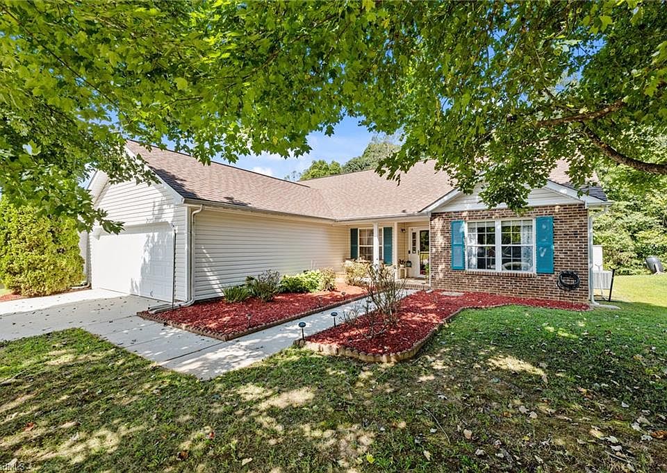 One level living in Greensboro! This home offers a spacious living room with wood burning fireplace, kitchen with vaulted ceilings, kitchen island with storage, pantry and all stainless steel appliances. Relax in the spacious primary suite with garden tub, separate shower and double vanity with great storage. Enjoy this split floor plan home with 2 bedrooms opposite the primary. Hall bath offers a shower/tub combo. This home offers an attached 2 car garage, landscaped entry with covered porch. The backyard offers a patio perfect for entertaining. Nestled at the back of Pleasant Ridge Farms West enjoy no backyard neighbors or through traffic. This home offers easy access to PTI airport and downtown Greensboro. Save on power bills with recently installed solar panel system. Transferrable warranty included for worry free savings!