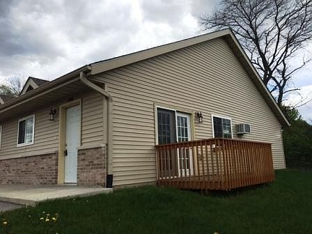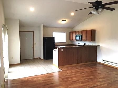 Open concept kitchen/living room with sliding doors opening to private deck. Stove, refrigerator, & dishwasher provided. Bedroom has large walk-in closet. Wall unit air conditioning. Shared coin operated laundry. Off street parking. Tenants pay electric. Owner provides garbage pickup, sewer, and water and provides lawn care and snow removal.