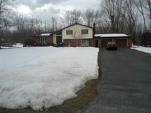 Spacious split level consisting of 3 bedrooms, 2 full baths; kitchen is updated with plenty of cupboards & granite counters; large room with cathedral ceilings & skylights now being used as a dining room, has french doors leading to a deck overlooking a picturesque lot. Family room has beautiful stone fireplace; central air; attached 2.5 car garage with openers.