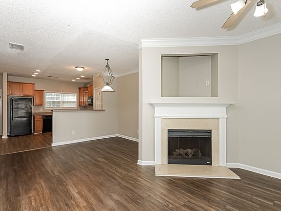 The living room features durable hardwood flooring and a cozy focal point that ties the space together. Nearby, the kitchen offers warm cabinetry, sleek black appliances, and ample counter space for easy meal prep. The dedicated dining area adds charm and functionality, creating a seamless transition between cooking, dining, and relaxing.