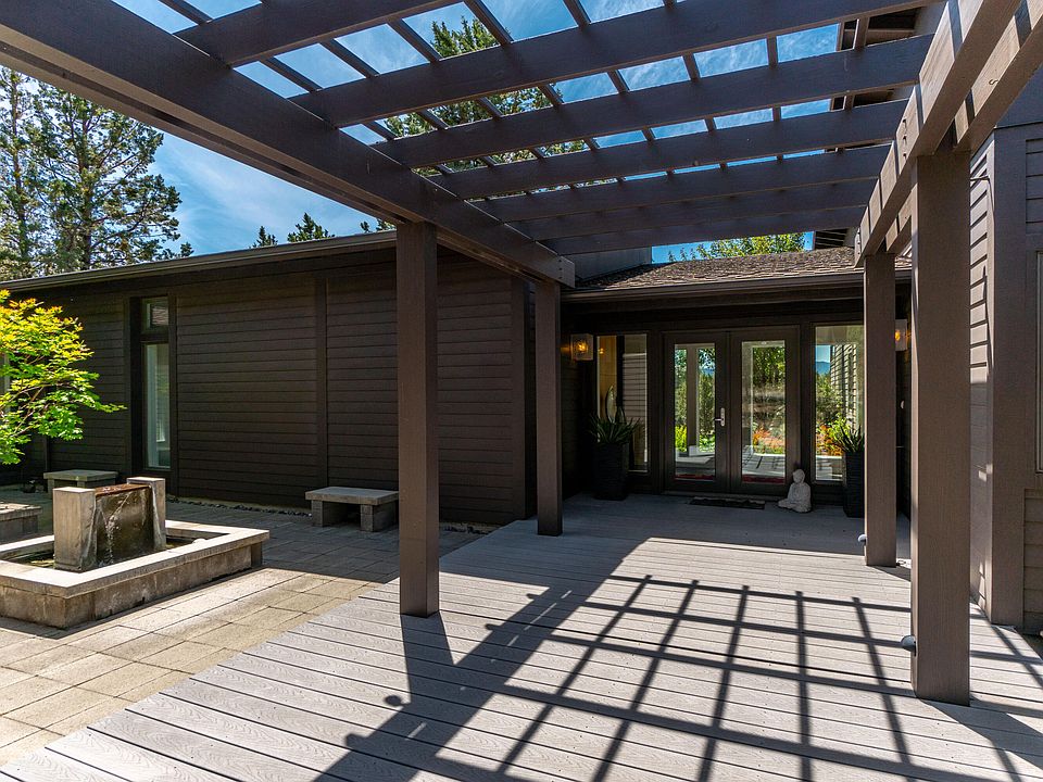 Anchored in classic design principles with a nod to Mid-century architecture, this timeless gem is a retreat in the community of Tumalo. Situated on 5 private acres, this home offers a peaceful escape from the everyday rush but is just minutes from the amenities of Bend. Inside, expansive floor to ceiling windows bathe the great room in natural light, overlooking open land & Cascade mountains. The open concept living area is spacious and flows seamlessly to the outdoors. Take your pick of an expansive west facing deck or a tranquil interior courtyard with mature maples and water feature. The distinctive primary suite includes a gas fireplace, access to the deck & hot tub and abundant custom storage. Two guest bedrooms & separate office/flex space complete the single level floor plan. Custom maple cabinetry is featured throughout the home offering abundant storage in style. Additional perks include an oversized 3 car garage, covered RV parking & charming fenced garden with greenhouse.