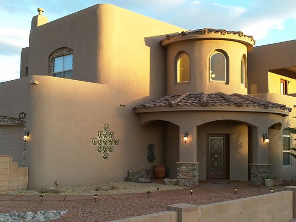 Dramatic entry invites you into this large 3 bedroom home. 22 foot ceiling in the foyer and entry hall. Sunken living room and all tile on the first floor. 10 foot ceilings throughout the first floor and 9 foot ceilings throughout the second floor. Heated and jetted garden tub in the master suite with oversized separate shower. Large 3 car garage, oversized doors with automatic openers. Covered patio and balconies for each bedroom total 1,000 square feet of covered outdoor living space. Home wired for intercom, CAT 5 data and surround sound in living room and first floor patio. Large lot with room for casita with separate entry and driveway. Home sits on a corner lot with unobstructed views of the Sandia Mountains. Great location close to schools and shopping.