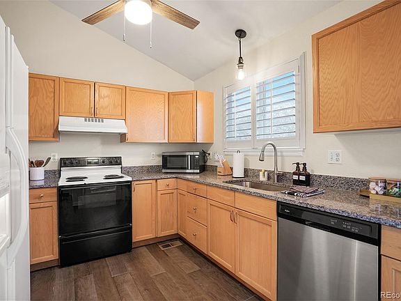 Do not miss this rare find in Arvada at this price point! This super cute home offers 4 bedrooms, 3 full baths, and an open floor plan with soaring 9’ ceilings. You’ll love the modern kitchen—complete with slab granite counters, new flooring, new lighting and a dedicated dining area. The main level shines with beautiful engineered wood flooring and flows seamlessly to a private back yard—perfect for playtime & entertaining. Retreat to your spacious primary suite with a walk-in closet and luxurious 5-piece bath. Three additional bedrooms are ideal for guests or a home office, complemented by another full bath. The convenient laundry with washer and dryer included makes daily life easy. The basement game room creates a welcome escape for friends and family.