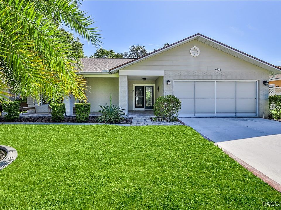 A paver walkway leads to the charming front porch and double-door entry. Inside, wide luxury vinyl plank flooring flows through the main living areas. The living room/dining room combination is highlighted by plantation shutters, a chandelier, a skylight, and French doors that open to both the family room and the enclosed lanai.