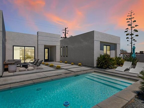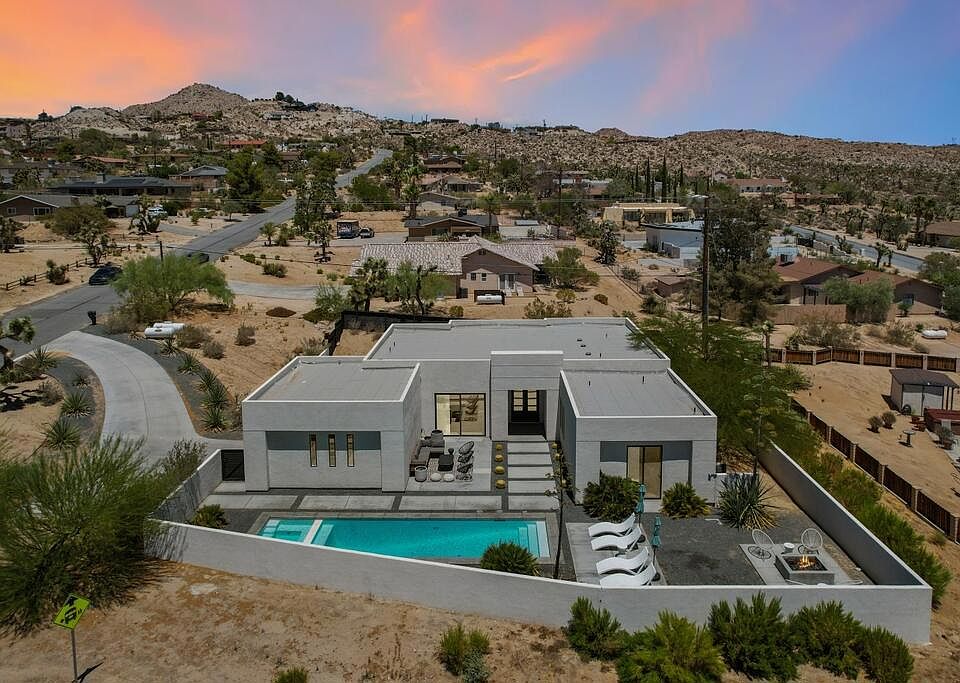 Come and see your desert resort home! Modern 3-bedroom, 3.5-bath home with breathtaking mountain views in a peaceful rural setting. This turnkey property features soaring ceilings, an open floor plan, and stylish built-in details throughout. The chef's kitchen impresses with a large quartz island, walk-in pantry, and premium appliances including gas cooktop, oven, microwave, and refrigerator. The luxurious primary suite offers a soaking tub, walk-in shower, double sinks, quartz counters, and a spacious walk-in closet. Sliding doors open to a private backyard retreat with in-ground pool, spa, and outdoor fire pit--perfect for relaxing or entertaining. Additional highlights include central air/heat, concrete floors, inside laundry, privacy fencing, desert landscaping, and a covered patio. An attached 2-car garage with driveway parking adds convenience. The home is currently on septic with a public sewer connection scheduled by late August. This stunning home blends modern design, everyday comfort, and resort-style living.