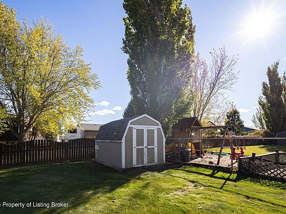 This home has so many amenities. A 20X24 heated shop plus a garden shed. Private well for underground sprinklers & watering trees, garden & perennials. Super large deck off the kitchen/dining area and steps down to a patio. The backyard is fenced. The double attached garage is 25X28 and is insulated & heated. There are 3 bedrooms on the main level. Within walking distance to Elementary school. Gas forced air and central air.