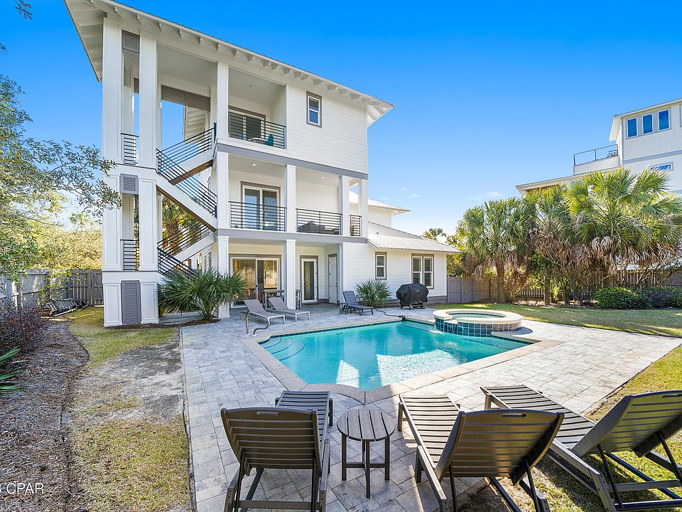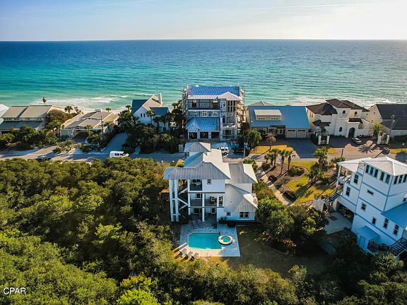 Located in highly touted Blue Mountain Beach, this contemporary beach house has superb gulf views right across the street from the white sandy beach. With over $200K in annual gross rentals this home is a powerhouse in Blue Mountain Beach. Completely renovated in 2022, it has ample room to expand in the oversized backyard. This peaceful private haven is in a quiet street and has its own heated pool, spa tub, outdoor shower and sprinkler system. There's even a surround sound system for listening to your own playlist while relaxing by the pool. Multiple balconies and private terraces abound on all three levels. They provide quiet nooks so that everyone can enjoy their own private space. Inside, this beautiful home has all the bells and whistles. The current owners have made their mark, reducing the garage in size and adding an extra bedroom and bathroom on the first floor. This additional guest bedroom and built-in bunk room make this the ideal rental vacation property for up 14 guests, or a main residence/second home for growing families. The home has a light bright interior with beautiful wood flooring and multiple oversize windows and doors. Stairs wind upwards to the second floor where the open living space is an irregular shape leading through the dining area to a well-appointed kitchen. There's a wine fridge for endless chilled beverages, a walk-in pantry and granite countertops. It's ideal for those who take food seriously with industrial-grade appliances making light work of snacks, family meals and entertaining. The breakfast bar supplements the formal dining table and there's access to the porch if you fancy dining outdoors. The entire third floor houses the master suite and boasts gentle sea breezes and expansive gulf views from the private balcony. A new roof, new exterior paintwork, dimmable lighting and a Rinnai water heater mean there's no to-do list when it comes to maintenance.