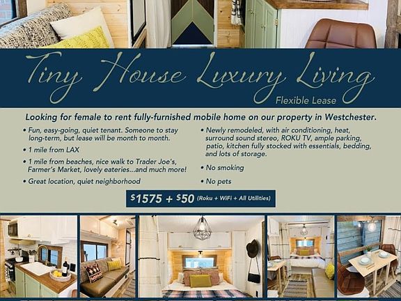 Luxury Furnished Tiny House by the beach Flexible lease. Renting my brand new totally remodeled tiny house mobile home in Westchester. 1 mile from beach, walk to shops, Trader Joes Farmers Market,1 mile to lax and Loyola Mary Mount University Gated private entrance, free parking, laundry on premises, Wood floors,Full bathroom,furnished with bedding,memory foam mattress,stereo,flat screen tv,heat,air conditioning,solar panels,kitchen essentials,3 closets,extra storage,bike storage ,yard and grill access,quiet neighborhood. A mobile home is on my property. Utilities 75.00 Wifi Roku Air Heat Trash Gas Water Please call or email Kerri for details - see contact information