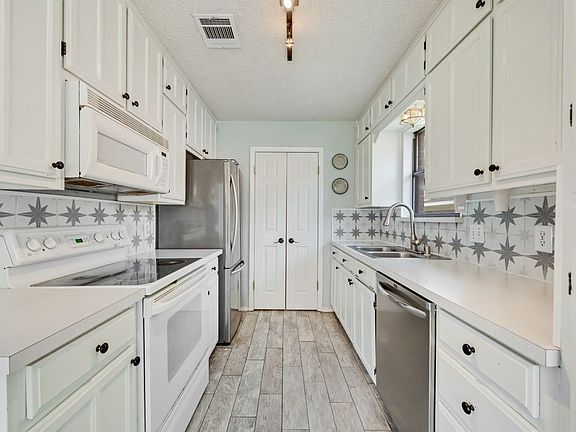 Brick woodburning fireplaceChalkboard paintSplit bedroomsGalley kitchenBeautiful decorator backsplashLarge primary suiteNewer walk-in shower