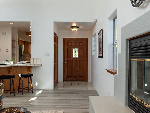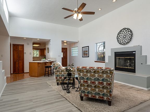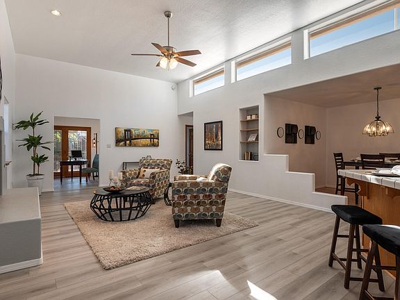 Location, Location!! Charming one owner townhome in Bear Canyon with wood, tile and laminate floors, tall ceilings, open floor plan, dining room, large living room with raised ceilings, fireplace and clerestory windows. Separate office/studio and 2 bedrooms . New TPO roof in 2025. Private side yard and back patio with mature trees. Close to walking trail around ABQ Academy. Move-in ready!