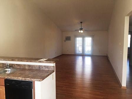 Open concept kitchen/living room with sliding doors opening to private deck. Stove, refrigerator, & dishwasher provided. Wall unit air conditioning. Shared coin operated laundry. Off street parking. Tenants pay electric. Owner provides garbage pickup, sewer, and water and provides lawn care and snow removal.