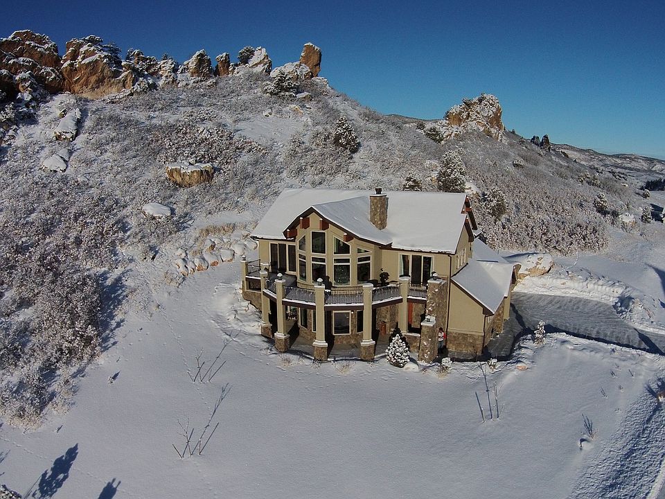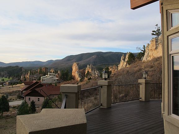 2012 custom-designed mountain style home with all main living and master suite on one floor. Every bedroom has an ensuite. Open plan living/kitchen/dining area with gorgeous beamed cathedral ceiling, granite countertops, wood trim, cherry cabinets, 3-sided gas fireplace and hickory floors. 10-11 ft ceilings and 8 ft doors throughout the remainder of the home. Second gas fireplace in downstairs family/rec room. Whole-house water conditioning system. Wrap-around 700sf deck and lower level patio open out to expansive south-facing yard with views that won't be built out. Dumbwaiter provides direct access for groceries etc from 3-car garage to kitchen. Third garage is oversize with 10ft door and high ceiling. 340sf workshop has built-in cabinets and solid wood benchtops with steel drawers underneath and 230V, 20A and 30A outlets throughout. Flat, reinforced concrete driveway has room for plenty more outside parking. One of Perry Park's most respected builders constructed this home to exceed structural and energy-efficiency requirements.
