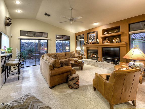Charming small community, all single story homes, nestled in the luxury Ventana County Club corridor. Situated on a prime Mountain view lot, home features open & easy living floor plan w/ large rooms. Spacious eat-in kitchen with granite counters, updated SS appliances, incl. warming drawer, plus Breakfast Bar. Great Room with soaring ceilings, gas fireplace and wall of windows to stunning back and side patios. Back Patio w/ wonderful Mtn views, fountain, gorgeous landscape plantings & pots, with privacy provided by lush desert wash. Side Patio w/piped-in Gas BBQ, ample seating areas, & access from Primary BR. Minutes away from Loew's Ventana Resort, Ventana CC, shopping, & restaurants. New HVAC, newer water heater, roof just inspected /new skylights & all repairs. Beautiful Comm Pool!