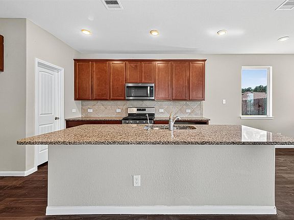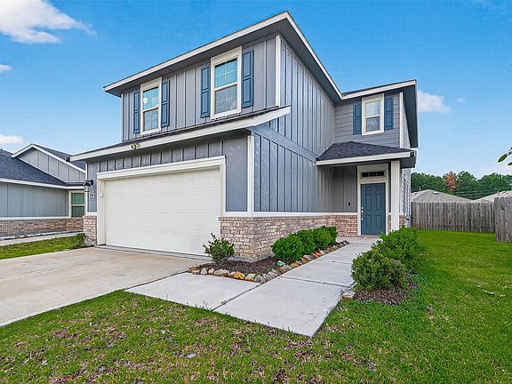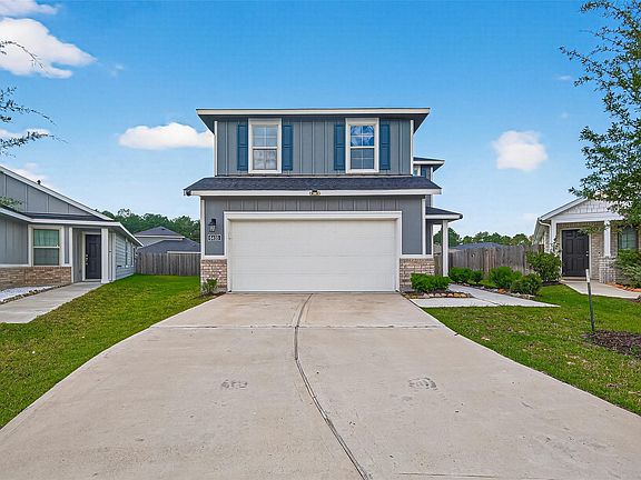 Tucked away in a quiet cul-de-sac, this inviting home welcomes you with a spacious driveway and oversized garage. Step inside to an open floor plan where the kitchen shines with stainless steel appliances, granite countertops, and a view of both the dining area and living room. Engineered hardwood floors and abundant windows fill the space with warmth and natural light. The first-floor primary suite offers comfort and convenience with its generous size, bright windows, en suite bath, and large walk-in closet. Upstairs, you will find two additonal bedrooms featuring plush carpeting and ceiling fans, along with a full guest bathroom complete with a tub/shower combo. A roomy utility area provides washer and dryer hookups, while the backyard offers a large patio and plenty of space to create your own private retreat. Come home to comfort, space, and style!