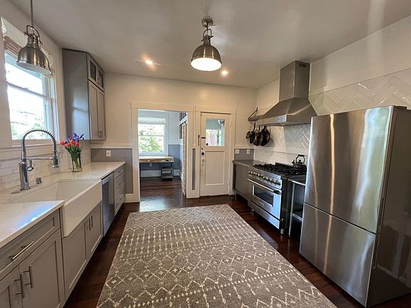 The home has been recently renovated throughout. In-unit laundry and dryer. Large kitchen with stainless appliances, new countertops, tile backsplash, farmhouse sink and large external vent hood is great for those who love to cook. Bathroom has new, marble-tiled rain shower over tub and plenty of storage. The living room, kitchen, and separate dining room are all generously sized, full of craftsman character and flooded with light. Both bedrooms are lovely. Each has lots of windows and a full-size closet. Separate sunny breakfast nook area off the kitchen overlooking the back yard also makes a great additional office space. Big fenced-in back yard with two mature redwood trees. One-car driveway parking, as well as ample street parking on the block.