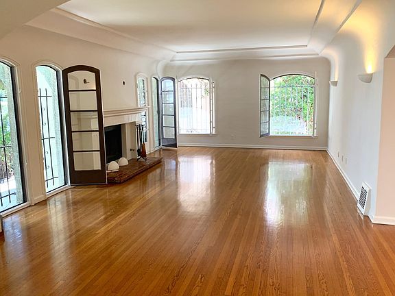 BEAUTIFUL DUPLEX in Beverly Grove in a wonderful building on a lovely tree lined street. This lower apartment is full of charm and enormous with large rooms and tall ceilings and gleaming oak floors throughout. It was built in 1929 and is filled with wonderful original details. The expansive living room, surrounded by tall French windows, has a wood burning fireplace and a side nook on the west. The sizable formal dining room leads to a breakfast room with a large built in side cabinet. The generous master bedroom has tall windows and doors opening to enclosed plant patios. The second bedroom makes a great den and the back bedroom is en suite and is a perfect guest room. The master bath has beautiful Deco tiles and a soaking tub separate from the shower. It has a great kitchen with granite counter tops. There is central A/C and a washer & dryer. It comes with one covered parking space and there's plenty of street parking. Owner pays for water and gardener. Tenant pays gas and electric