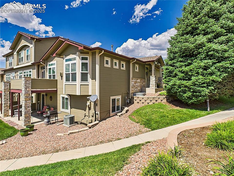 Enjoy effortless one-level living in this beautifully maintained 3-bedroom, 3-bathroom end unit townhome, perfectly situated to take in breathtaking views of Pikes Peak and the Front Range. This home offers a spacious and thoughtfully designed layout with vaulted ceilings and wood floors throughout the main living areas, creating an inviting and open atmosphere. The bright and functional kitchen features a pantry, breakfast bar, and easy flow into the dining and living spaces. Relax by the cozy gas fireplace or step through the living room door to the deck and enjoy panoramic mountain vistas. The main level includes a convenient laundry area, two bedrooms—including a primary suite—and carpeted comfort in all bedrooms. The walk-out lower level offers a second ensuite with access to a covered patio, a spacious bathroom complete with a charming claw foot tub, a large family room, and a versatile flex room perfect for an office, gym, or hobby space. Additional highlights include: • Well-maintained green space surrounding the home • Large crawl space for easy access and storage • Separate storage room with built-in shelving • Two-car garage plus additional guest parking directly behind the unit This low-maintenance home offers comfort, functionality, and beautiful surroundings—ideal for easy living with room to spread out. Don’t miss this perfect place to call home – schedule your private showing today!