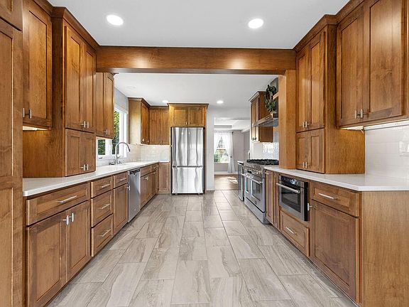 Impressive 4 bedroom home situated on a scenic lot. Come see this spacious remodeled kitchen (Amish made cabinets in early American style, 48 inch Forno gas stove, Forno microwave drawer, quartz counters, new ceramic flooring). First floor also includes a family room (gas fireplace, plenty of natural light with 3 large windows), dining room, first floor laundry and a half bathroom. Step outside onto a large deck w/terrace, a new concrete patio, storage shed and fenced yard. All of this overlooking a scenic pond, making this a relaxing retreat in your own backyard. Upstairs there are 4 bedrooms and 2 remodeled bathrooms (Primary bathroom has a claw tub and a renovated shower). Brand new roof, gutters and downspouts.