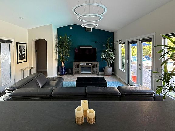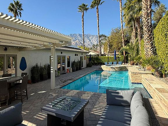 Welcome to the beautiful Park San Rafael gated community. This desirable 3-bedroom, 2-bath home offers a resort setting with a stunning view of the San Jacinto mountains from a private backyard designed for luxurious outdoor living. The spacious interior features soothing accent colors where an open floor plan enlivens a party friendly atmosphere sparked by two large TVs for entertainment. An optional dining room table doubles as a pool table. The nicely appointed primary and guest ensuites offer private baths with bidets. - Large Pebble-Sheen salt water pool and hot tub plus an outdoor shower- HVAC and pool equipment recently upgraded- 35-owned solar panels provide substantial electric power to lower utility costs- 240V electric vehicle outlet in garage - Total property water filtration system includes reverse-osmosis drinking water- New premium kitchen appliances- Timer controlled outdoor lighting and irrigation- Two large cantilever umbrellas provide shade- Pergola has two remote control roll shades plus a large ceiling fan- Artificial turf putting green adds to the fun- Some indoor and outdoor furnishings are negotiable if desired by buyer- Arlo Security System negotiable (8 cameras with phone app control)- Sales agent can provide details about negotiable items