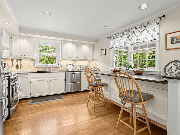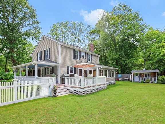 Nestled on a pristine 1.5-acre country setting, this gorgeous homestead will captivate you with it's charming 4-bedroom, 2 bath Colonial featuring a stunning oversized custom detached garage/barn with a workshop. A front porch welcomes you inside the updated kitchen boasting white cabinets, stainless steel appliances, black granite countertops, and a breakfast bar plus a separate dining space with custom woodwork. The open floor plan highlights a stunning large stone fireplace, and beautiful hardwood floors throughout, while a relaxing four-season sunroom provides a peaceful retreat and deck access. Upstairs, you'll find 4 generously sized bedrooms and a full bath. The professionally landscaped and hardscaped grounds include a fenced-in backyard, two outdoor sheds plus a recently renovated artist studio. The home is adorned with weathervanes and cupolas that enhance its character. Unwind at the end of the day on your deck overlooking the lovely grounds of this exceptional property.