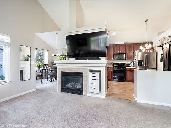 Welcome home to this bright and inviting 2-story-end-unit townhome. This unit offers a 2-car garage, open floor plan, and tons of natural light. The bright living room features vaulted ceilings and a cozy fireplace, while the dining room opens to a private balcony with tree views. The kitchen includes 42" cabinets, ample counter space, and all appliances. Main level offers 2 bedrooms + loft, perfect for a home office or flex space. Primary suite includes walk-in closet & private bath. Lower level features a spacious family room, laundry area (washer/dryer stay), and custom barstools included! Located near downtown Grayslake, great schools, and all conveniences. Move-in ready and waiting for you!