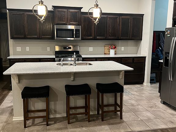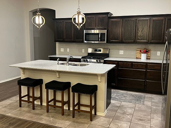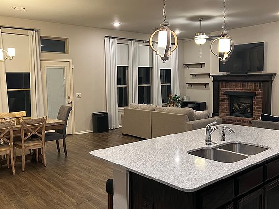 This stunning rental home, available at the end of November 2025, features numerous upgrades and desirable amenities. The open-concept living space boasts high ceilings, elegant light fixtures, and a modern kitchen with granite countertops, a large island, and dark wood cabinetry. The spacious dining area is perfect for entertaining, with stylish lighting and a cozy atmosphere. The mudroom offers built-in storage and a bench, making organization a breeze. Throughout the home, you'll find a beautiful blend of tile and wood flooring, creating a warm and inviting feel. The large windows allow for plenty of natural light, and the living room showcases a charming brick fireplace with custom shelving. This home provides the perfect mix of comfort and style don't miss out on this incredible rental opportunity!