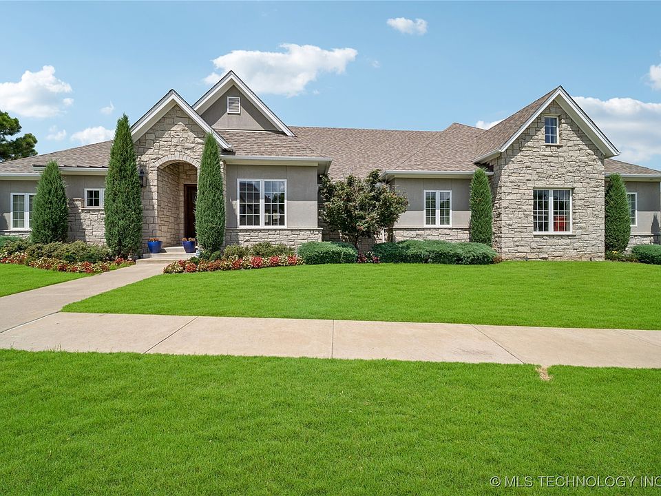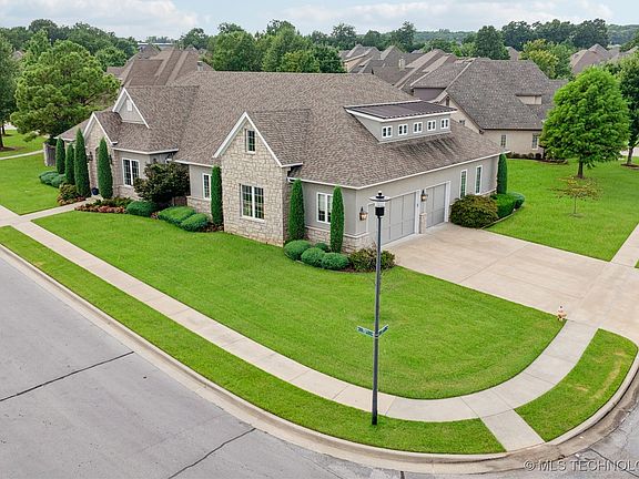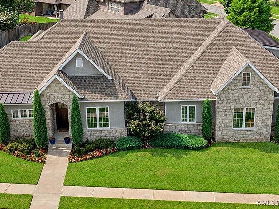 Discover exceptional living in one of Tulsa’s most desirable neighborhoods. Experience unparalleled luxury in this stunning custom-built, one-owner home nestled in the highly sought-after Stonebrooke community of Tulsa Hills. This exquisite home showcases custom finishes & upgraded details with impeccable craftsmanship throughout. Impressive quality construction with 2x6 framing & a crawl space foundation. Enjoy energy-efficient comforts that include low-cost geothermal heating & cooling, Anderson windows & spray foam insulation. Step inside to beautiful hardwood floors & a grand family room featuring a soaring beamed ceiling & a cozy gas log fireplace. The dedicated office boasts built-in bookcases & storage. The second first floor living/media space has sliding doors for privacy. The designer dream kitchen has a dramatic twelve-foot center island, granite countertops, custom cabinetry, double ovens, induction cooktop, Sub-Zero wine fridge & a spacious walk-in butler’s pantry. Discover refined luxury in the elegant first-floor primary suite, featuring a spa-inspired bathroom with a floating tub, custom-tiled shower & an oversized fitted closet designed for style & ample storage. Two additional first-floor bedrooms each feature private baths & walk-in closets. The versatile second floor presents a fourth bedroom/game room with a full bath. A bonus basement space provides the perfect area for exercise or game room enjoyment. Outdoor living shines with an extended covered patio & outdoor kitchen, ideal for entertainment. The impressive insulated three-car garage includes water taps, floor drains & storage. Professionally landscaped grounds compliment the home’s striking stucco & stacked stone exterior. Minutes from Tulsa Hills shopping & restaurants. Easy access to major highways. Top-rated Jenks schools, including Jenks NW Elementary. Neighborhood amenities include pool, clubhouse, basketball court, disc golf, parks, playground & trails