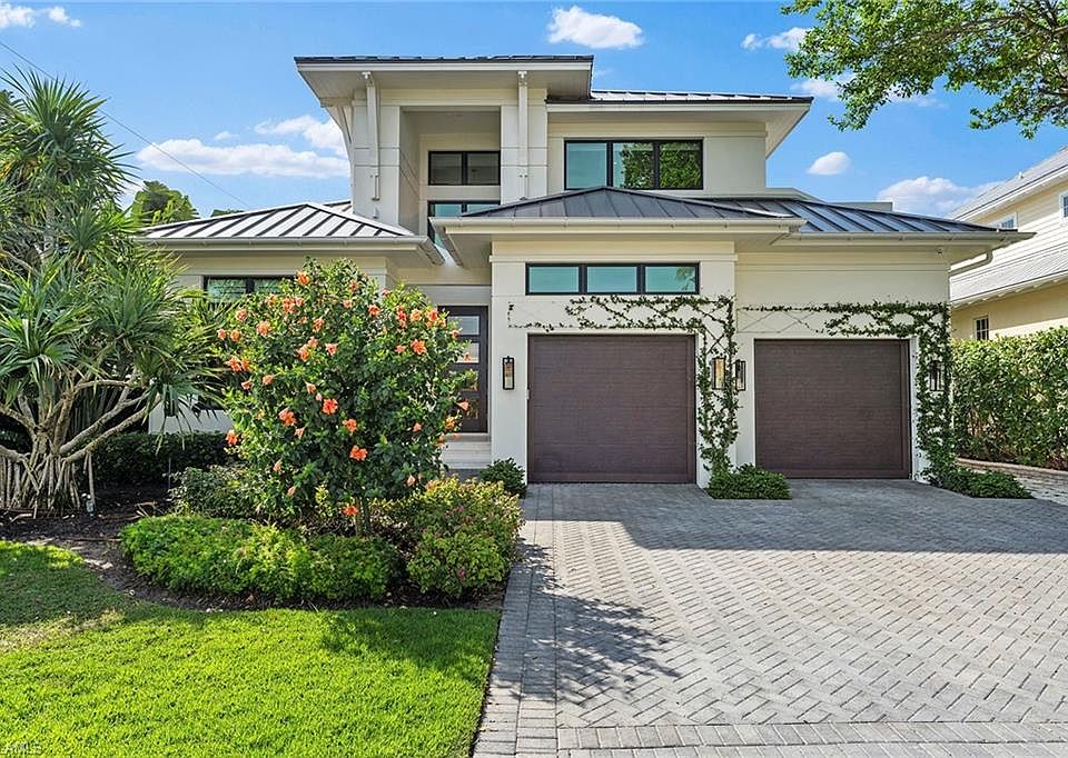In the vibrant heart of Old Naples, this beautiful residence offers an unparalleled blend of elegance and coastal charm. Just a short distance from shopping and dining on Fifth Avenue and only five blocks from pristine gulf beaches, this exceptional property is the ideal retreat for those who crave luxury and convenience. Go inside to discover an open and airy floor plan, where natural light pours through expansive windows, illuminating stylish living spaces and linear stone fireplaces. The seamless indoor-outdoor flow invites you to relax in the private, lush landscaped backyard, complete with an inviting pool, tranquil fire pit, and multiple areas for lounging and entertaining. The spacious light-filled primary suite is a sanctuary, offering a serene retreat. The spa-like bath includes a soaking tub, a walk-in shower and dual vanities. The home also features four beautifully appointed upstairs guest suites, each designed for comfort and privacy, along with an additional upstairs living area. A generously sized laundry room and an oversized two-car garage complete the space, adding convenience and functionality to this remarkable home.