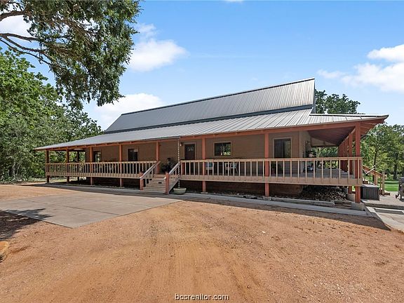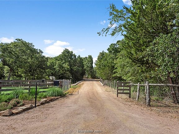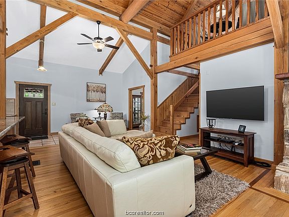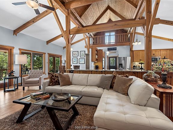 Majestic, handcrafted, timber-frame home on five wooded acres in College Station. Skillfully constructed using timber elements and connected with handcrafted, mortise-and-tenon. The centuries-old method of framing delivers a structure with distinctive character, natural beauty, and rustic elegance. Over 1700 sq ft of covered porches provide lots of places to connect with family, friends and nature. Light-filled, open concept kitchen, dining and living rooms in over 2400 sq ft of living space with tile and hardwood floors. Kitchen features double ovens, massive amounts of bar and counter space, pantry, storage and desk. Petrified rock fireplace is a focal point with decorative insert of specially collected arrow heads. Home three bedrooms (one currently used as an office), three full bathrooms, cedar-lined closets and an amazing loft or second living area. Primary suite has separate vanities, large shower, beautiful built-ins and private porch access. Outbuilding offers garage space plus a separate room; currently used as a potters studio, but could serve as a shop, office or additional living space with electric, water and air-conditioning. New expansive patio between home and outbuilding is great for entertaining. Property has a private electric gate, is fenced and cross-fenced, has a barn with three stalls, electric and water, pond with dock and a dry-weather creek. This is an enchanting property you’ll have to see to believe.