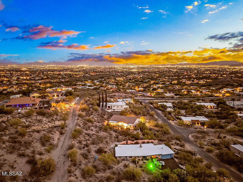 Perched high in the sought-after North Tucson Foothills, this stunning ranch-style home offers a rare blend of panoramic city light views, sweeping mountain vistas, and peaceful desert living. From sunrise over the Catalinas to sparkling skyline nights, every window frames a breathtaking desert masterpiece. With 2,351 square feet of thoughtfully redesigned living space on nearly an acre, the property captures sweeping mountain views, twinkling city lights, and the quiet charm of saguaros lining the hillside.Inside, every detail has been elevated with timeless finishes. Warm porcelain wood-look tile stretches throughout, while granite countertops upgrade every hard surface--including all bathrooms--for a clean, cohesive aesthetic. The open-concept great room, wired for surround sound and anchored by a sleek gas fireplace, flows into a chef-inspired kitchen featuring KitchenAid stainless steel appliances, gas cooktop, double ovens, tumbled stone backsplash, soft-close cabinetry and an oversized island ideal for everyday living or easy entertaining. A wine fridge, color changing uplighting, a back-lit onyx wall on the bar and a butler's pantry with a second fridge add extra function with flair.