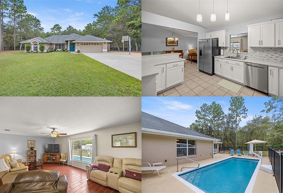 Welcome to this amazing sanctuary in South West Marion County. Come and enjoy the peace and quiet of Rolling Hills with no HOA! Brand New Roof! This Pool Home is on over an acre of land with mature landscape and a 12x24 in Ground Pool that was just installed in 2022, complete with child safe black aluminum ornamental fence surrounding it. The entire property has four board, no-climb wire perimeter fence that is separated into the front yard and a back yard. The front gate and side gates give the property extra security and privacy. The kitchen is the center of the home with quartz countertops, soft close cabinets and newer appliances including a gas range. The primary suite is privately set off to one side of the home with a spacious bathroom with a soaking tub, stand in shower and an ample walk-in closet. Most importantly, the primary space leads out to the Florida room that was recently enclosed with glass sliding windows for year-round comfort while overlooking the pool and backyard. The other three bedrooms and two bathrooms are situated down a private hall on the opposite side of the main living areas. This split floorplan is ideal for multigenerational or larger family living. The outdoor living and entertaining possibilities are endless here with the addition of a second lanai added in 2022 to the Florida room in direct view of the pool, firepit and gardening beds. Enjoy views of the western sunsets and stunning vantage point views of the moon through its phases in the backyard. There is also a 12X20 shed with a drive-up ramp for your lawn mower and roll up door for your convenience. The front driveway was extended and expanded in 2023 and includes a permanent adjustable basketball hoop just off the garage. Other recent updates include brand new septic tank, water heater, custom window blinds, a new 2023 Lennox ac system with WIFI enabled Ecobee controls and the septic system was cleared July 2024. This property has been meticulously maintained with pride of ownership throughout. A desirable location between Ocala and beautiful Rainbow Springs in Dunnellon with an easy commute to I-75, Gainesville and only a quick 10 minutes to the World Equestrian Center. Hurry and come take a look!