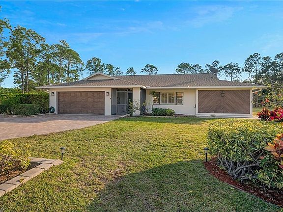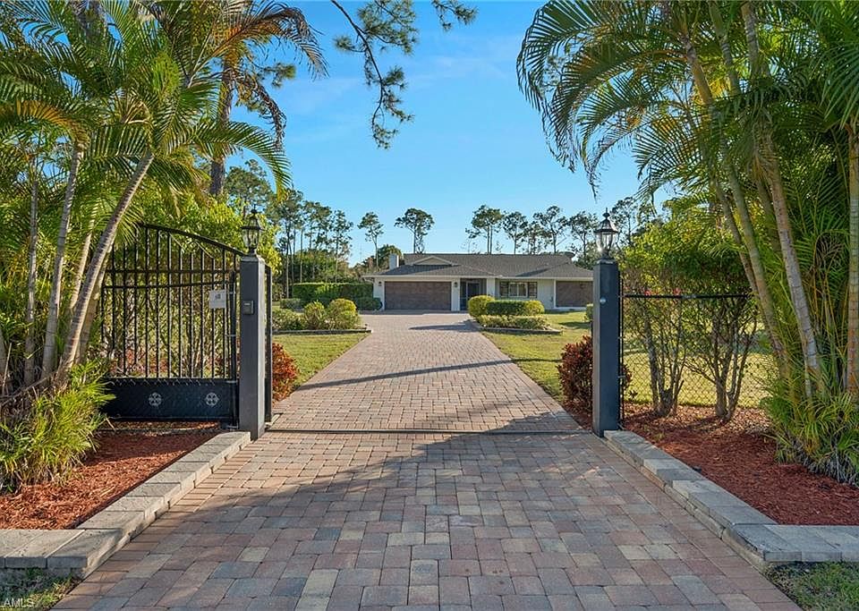 Welcome to this exceptional 2.5-acre corner estate in the highly desirable Livingston Woods community. Fully fenced and secured by a private electric gate, this property offers privacy, space, and freedom for both family living and pets. The residence has been thoughtfully remodeled and features a spacious primary suite, two guest bedrooms with bamboo wood flooring, a custom built-in office, and a beautifully updated kitchen. Refined finishes include crown molding throughout, plantation shutters, and elegant granite and marble countertops. Indoor-outdoor living is enhanced by both screened and open brick-paver lanais. The primary suite offers direct access to the screened lanai, an oversized walk-in closet with custom shelving, and a well-appointed en-suite bath with dual vanity space. The kitchen is equipped with new stainless-steel appliances and opens seamlessly to both the family room and living room, creating an ideal layout for everyday living and entertaining. Step outside to your private resort-style retreat featuring a sparkling pool and spa, generous seating areas, and convenient access to a guest bathroom—perfect for enjoying Florida’s year-round sunshine. This pet-friendly estate combines comfort, privacy, and lifestyle in one of Naples’ most sought-after acreage communities. Leave the snow behind and embrace refined, poolside living.