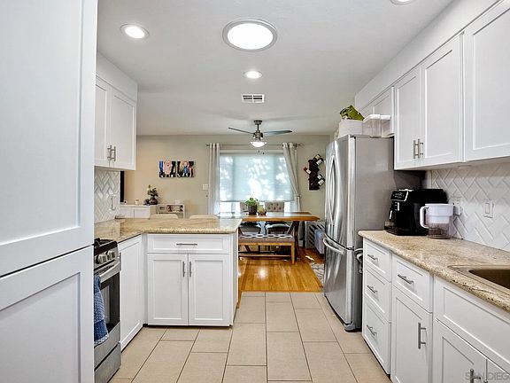 BACK ON MARKET. No fault of seller. Here is your opportunity to own this charming home. Fabulous top of the hill VIEWS. Cozy La Mesa home with a view. The hardwood floors throughout the house with a walk thru kitchen, new Kitchen cabinets, granite counters, updated bathrooms are just some of the charm this home has to offer. Covered huge patio for entertaining leads you to the fantastic East, North and West views. Enjoy the huge fenced in side yard for kids to play. Nice size storage shed keeps yard tools and toys stored away. 2 car garage includes EZ charging station for todays electric vehicles. This slice of pie shaped Cul-de-sac spacious lot on a very quiet hill top street, gives that elbow room feel, catches nice breezes and surrounded by the best neighbors. Great home for entertaining. Sellers have outgrown this great starter home and have maintained the condition up to date. Property is located near all shops, schools, highways. Come feel the charm this home has to offer. Don't miss seeing this charming home.
