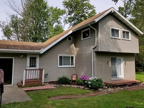 Stunning Beauty in the woods on over an acre with 189 Feet of water frontage~ This home has been updated with A/C & Furnace in 2017, also new windows throughout allowing for natural sunlight. The kitchen was updated in 2020 and opens to a Great room with vaulted ceilings and a spiral staircase to the upper level loft. There are three more bedrooms, bath and a porch with stairs that lead outside to a beautiful new composite deck. The main floor has a bedroom and bath, Spacious family room with a sliding door, Meticulous yard with various annuals that bloom all summer long. Main floor laundry, attached 1 car garage and shed. Enjoy the beauty of nature watching the swans on your own private roll away dock. Convenient location to shopping and restaurants, approx. 2 hours to Chicago.
