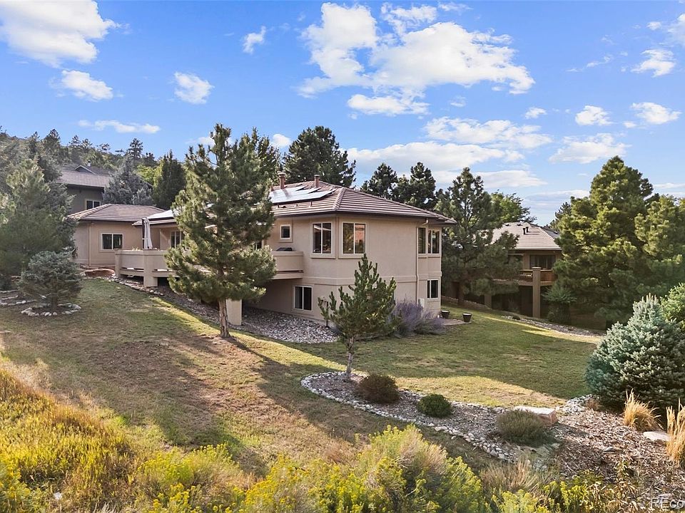 Nestled in the stunning gated community of Roxborough Park, surrounded by dramatic red rock formations, this 5 bedroom, 3 bathroom home offers the perfect blend of Colorado charm and ease of living. Step inside to find luxury California wide plank hardwood floors, soaring nine foot doors, and plantation shutters throughout. The main level boasts a cozy living and dining area with a Texas limestone wall feature, spacious primary suite with a spa-like ensuite, a secondary bedroom, and a second full bathroom. The chef’s kitchen is a dream, featuring stainless GE Monogram appliances, including a side-by-side refrigerator and freezer, 6 burner gas stove, built in wood-fire oven, granite island seating for nine, under cabinet lighting, and abundant storage—all designed for both everyday living and entertaining. Enjoy cozy evenings by one of two gas fireplaces or take the party outside to the large deck, perfect for watching local wildlife wander along the adjacent greenbelt. The walkout basement offers ultimate entertainment with a home theater, pool table area, additional living space, three bedrooms and a full bathroom. A detached office and private workout room, connected to the front of the home by a breezeway, provide quiet spaces for work or fitness. Additional highlights include seller-owned solar panels, an in-ground trampoline, and morning visits from local wildlife right outside your door. Roxborough Park’s gated entry, natural beauty, and sense of community make this property a true retreat—just minutes from hiking trails, golf courses, and all the amenities you need.